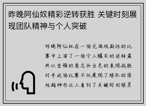 昨晚阿仙奴精彩逆转获胜 关键时刻展现团队精神与个人突破